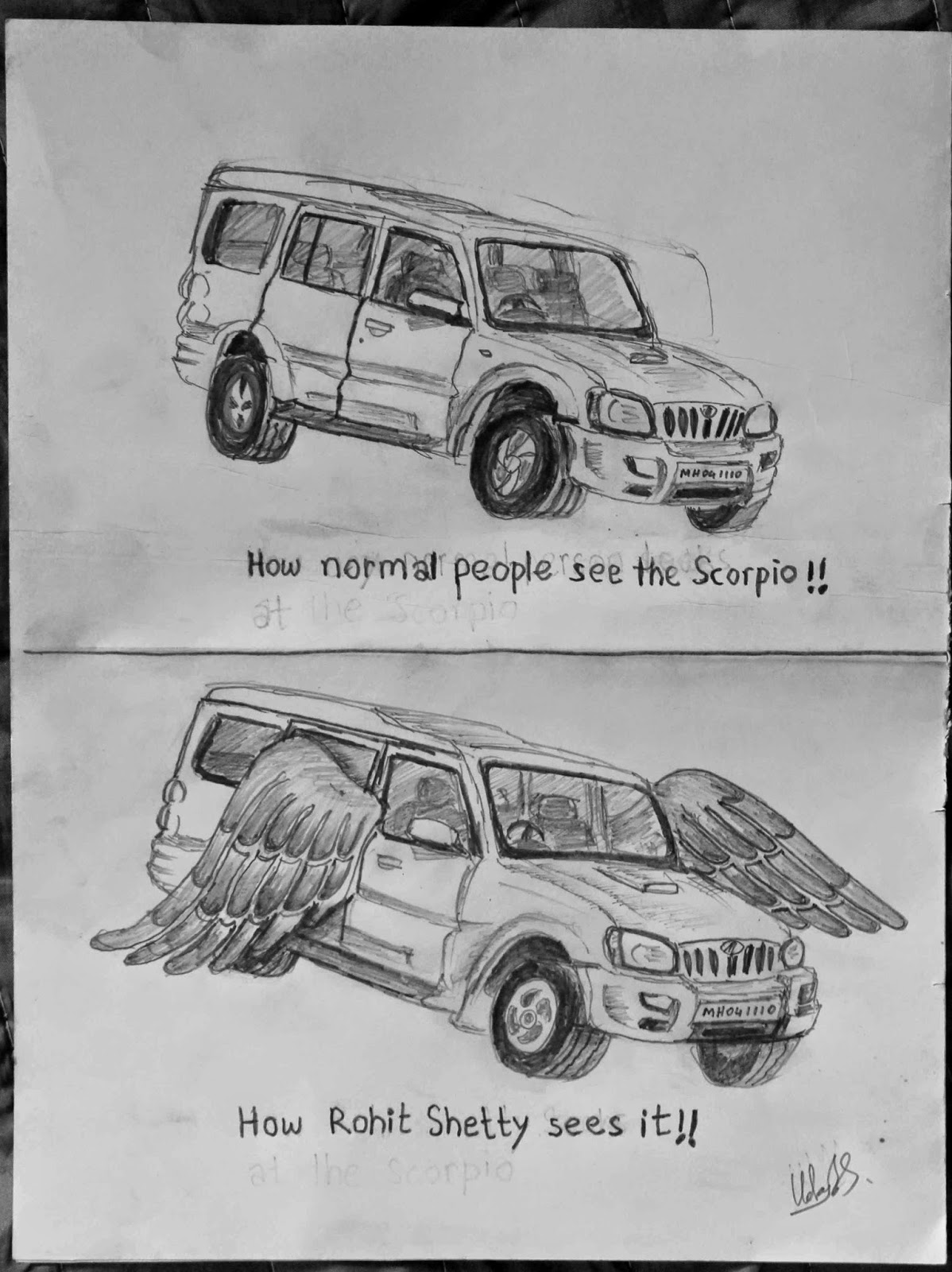 scenes involving vehicles (especially the Mahindra Scorpio) in almost all his movies. So, I decided to show the different perspectives of looking at the Mahindra Scorpio: The normal human perspective and the Rohit Shetty perspective. ;) . The sketch below shows that. :D